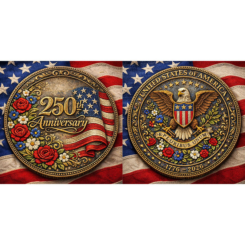 The front side displays the inscription “250th Anniversary” set against a flowing American flag backdrop. Intricate floral patterns surround the text, symbolizing remembrance, honor, and enduring beauty. The combination of patriotic colors and ornamental detailing reflects both national heritage and refined craftsmanship.